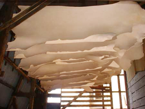 溶液を含んだ皮から余分な水分を絞り出した状態になったら、風通しのよい皮干場で、半渇きの状態になるまで干します。