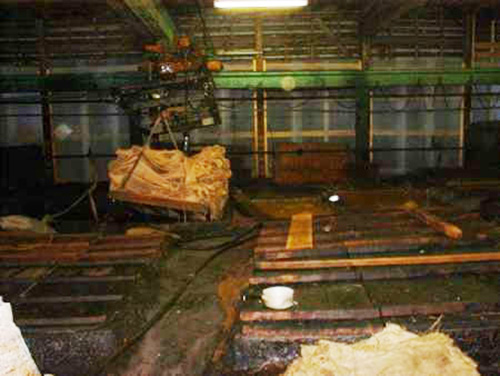 塩付けの状態で保存された原皮(上)をドラム(下) に入れて、大量の水を流しながら回転し塩抜きします。