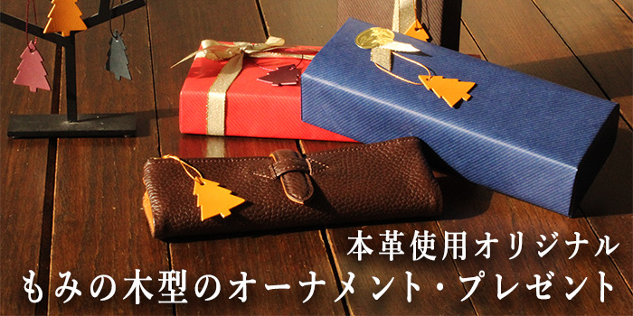 本革でつくった「もみの木型のオーナメント」をプレゼントいたします。