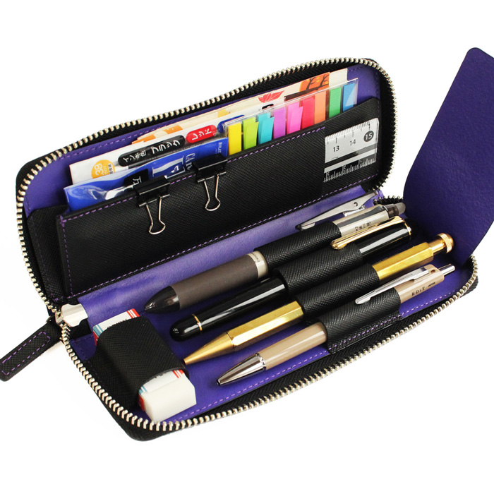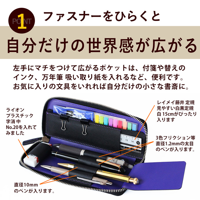 ファスナーを開けると自分だけの世界感が広がる大人のお道具箱 万年筆、ボールペン、シャーペン、消しゴム、定規など必要なアイテムをコンパクトに収納。 左手にマチをつけて広がるポケットは、付箋や替えのインク、万年筆 吸い取り紙を入れるなど、便利です。 お気に入りの文具をいれれば自分だけの小さな書斎に。 ■サイズ 約 7×18.6×2cm ■重量 約 112.5g ■素材 牛革 Wフェイス/プリズム ■縫製 ベトナム ■仕様 1本差し×4、マチ付きポケット×1、スリットポケット×1、消しゴムホルダー×1 ◆使用上のご注意 ペンホルダーは、太目(約直径1.2mmのペン)2本と細目(約直径1mmのペン)2本を収納可能です。 届いた当初はきつく感じても、ペンが入るのであれば、お使いになるうちに革が伸びてスムーズに入るようになります。