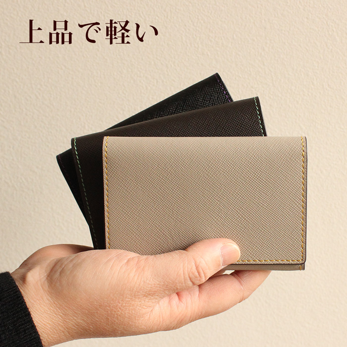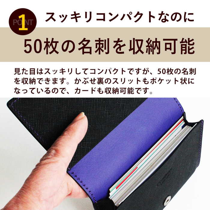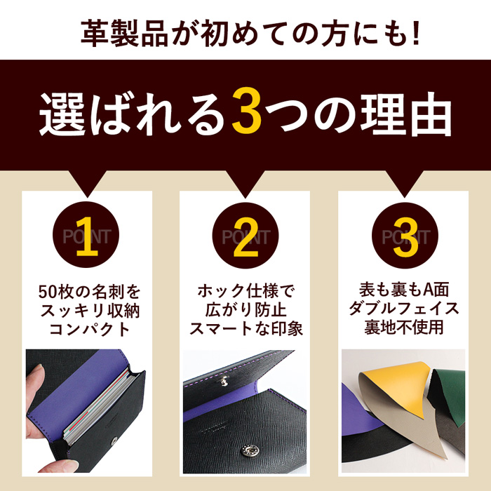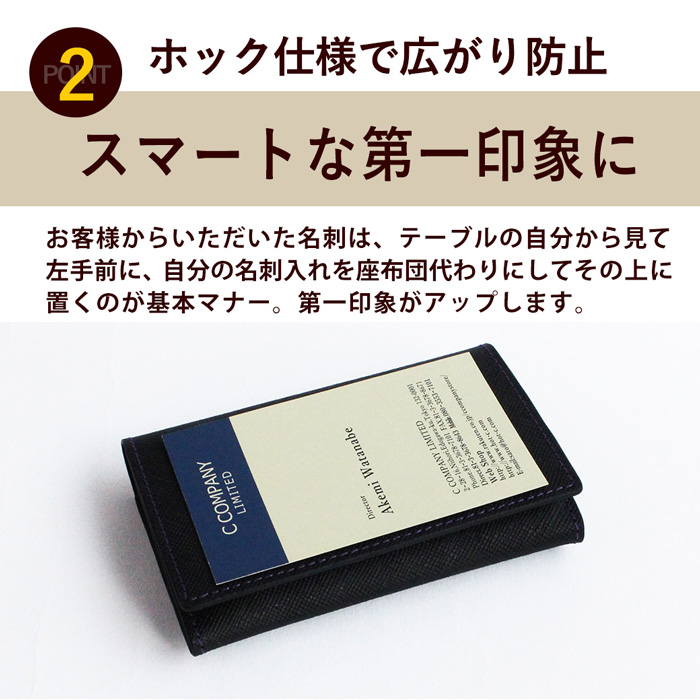 表も裏も表面のダブルフェイスの革を採用し、裏地を使用せず、革のみで作った名刺入れ。最大50枚の名刺を入れることが可能です。ホック仕様なので、届いた時からスッキリした上品な印象の名刺入れです。
